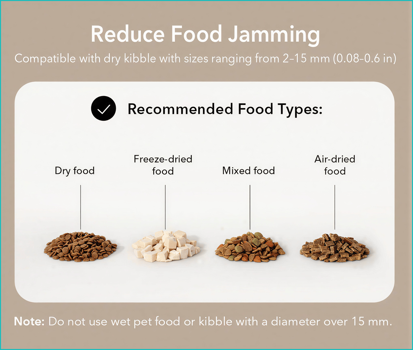 The feeder works best with dry kibble sizes ranging from 2 mm to 15 mm, which helps maintain smooth operation and reliable portion control.