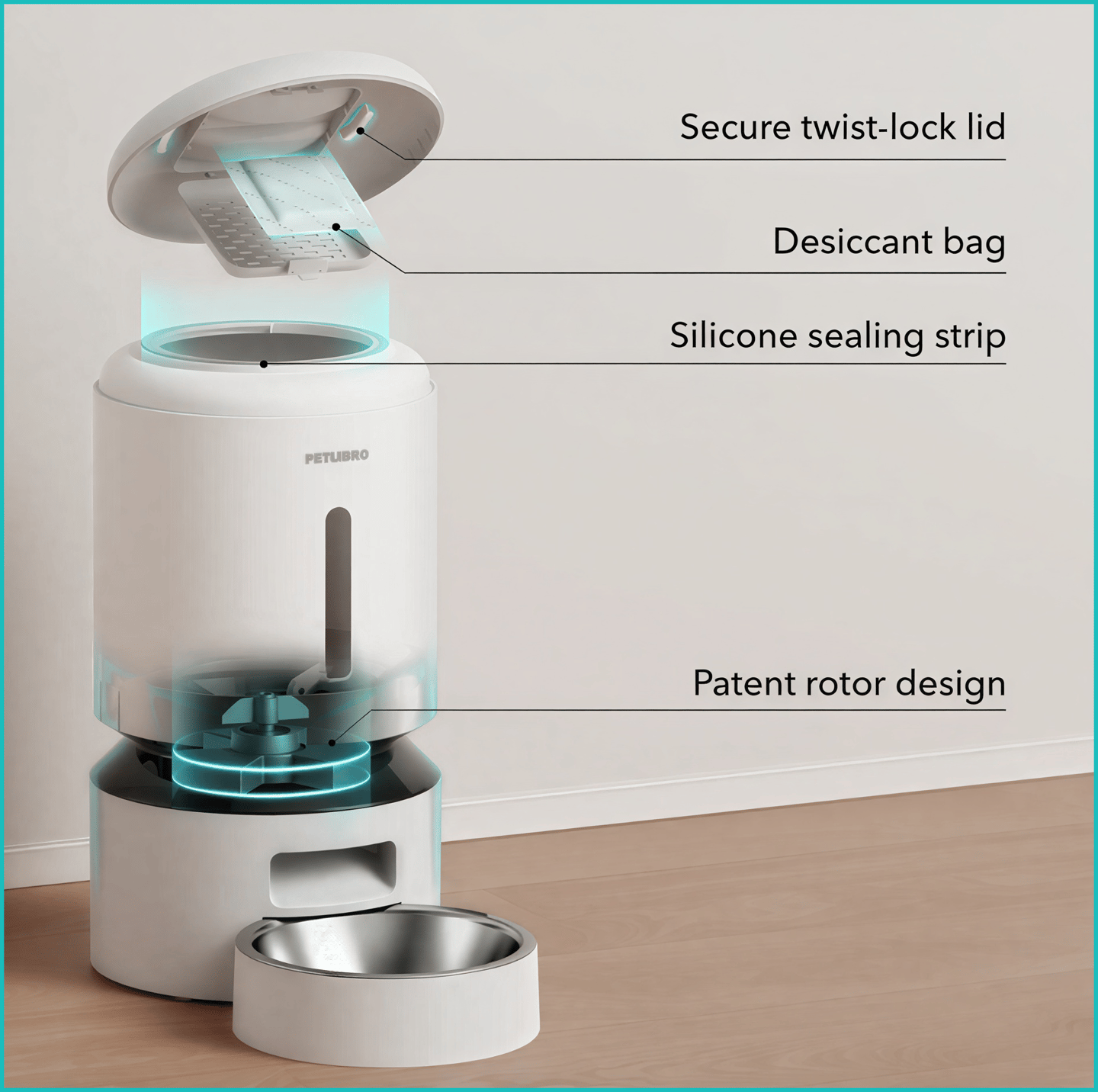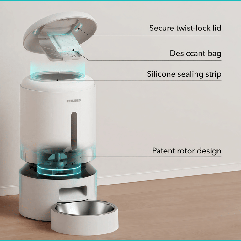 Maintaining food freshness is essential for both nutrition and taste. The feeder uses a quadruple sealing system to keep dry food fresh for longer periods.
